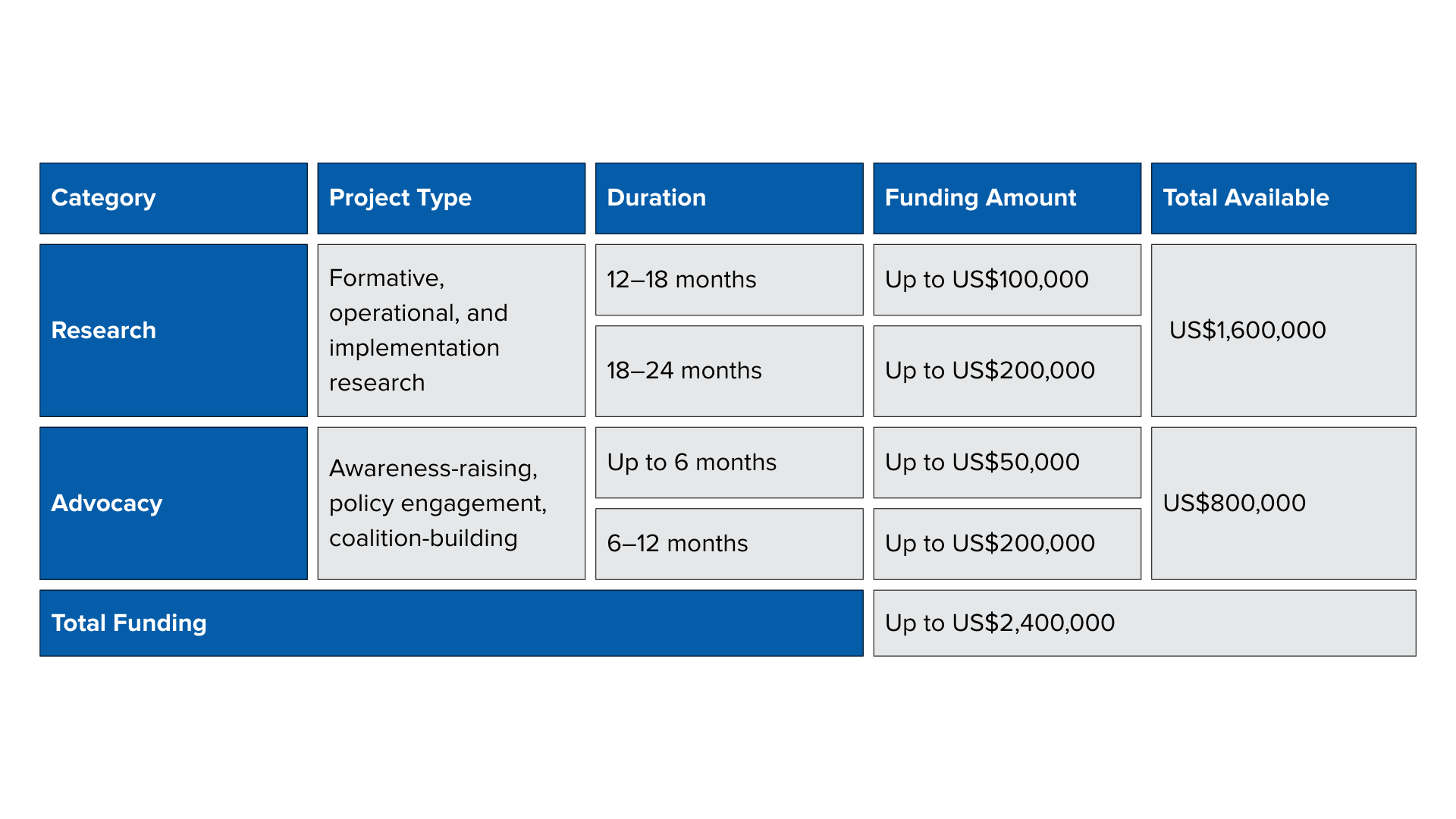 The Falcon Awards have a total funding envelope of up to US$2.4 million, allocated across two key categories: Research and Advocacy. Funding is awarded to winning concepts on a tiered basis, with longer-duration projects eligible for higher grant amounts. Please note that the total award amount will depend on the final, agreed project plan developed in collaboration with GLIDE.