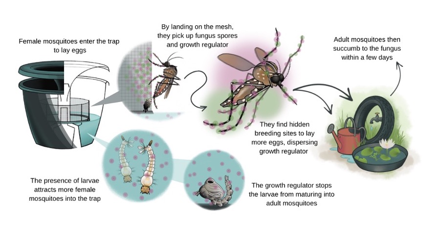 To address these challenges, the trial deployed a new mosquito control system designed to work with the mosquitoes’ natural behaviour to suppress populations even in hidden breeding sites.